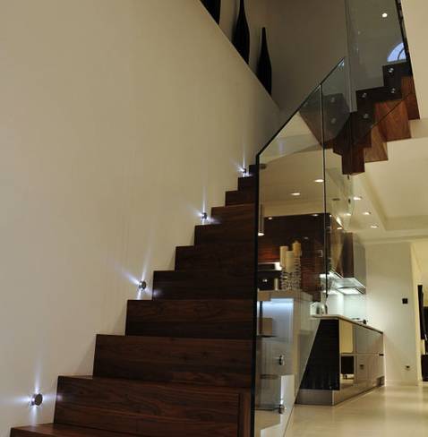 編輯點評:一般家里的射燈大都布置在柜體上方,滿足日常照明方便物件取用,其實樓梯的光照設計也是射燈出現的重要場所。射燈對空間、色彩、虛實感受都十分強烈而獨特。它時新潮流,與其它燈具相比,有相對的優勢。將射燈安置在墻裙邊圍,沿著樓梯拾級而上,溫暖集中的光線足夠照亮你腳下的每一步路。